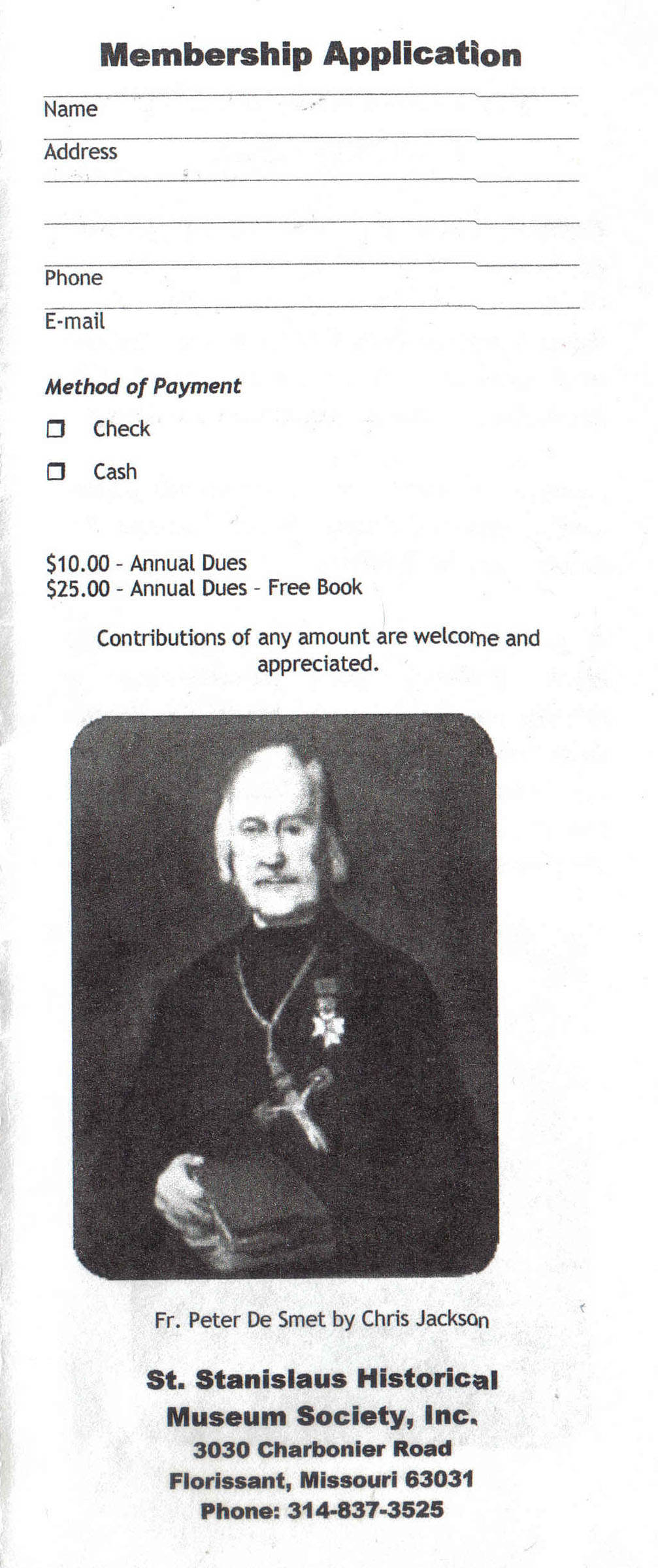 The St. Stanislaus Museum was started in 1972 by Fr. Claude Heithaus with the generous support of his brother William Heithaus. We have been a not-for-profit museum since 1976. Our vision is to preserve and display items of historical significance to the early history of the St. Stanislaus Seminary, Florissant and North St. Louis County relating to the development of the Midwest and Western United States in the early and mid 1800's. Our focus is on presenting items and information about the people of this area who went on to become contributors to this history whether they were missionaries, traders, trappers, farmers or scholastics. In addition, we try to illuminate how this area was during this time period discussing its French and Spanish origins influenced by other immigrants and historical developments. As part of this vision, we are encouraging individuals to join the St. Stanislaus Historical Museum Society as members, reaching out to the community for articles that would further add to our displays and looking to collect oral histories from families with a long history in this area. As a not-for-profit, any contributions, monetary or otherwise, are tax deductible up to the extent allowed by the law. Since September, 2007, we have enjoyed a great number of visitors including De Smet family members, school groups, scouts, area residents and seniors. We are a member of Historic Florissant and congratulate them on their 50 year anniversary. Thanks for your interest in our Museum. Your comments and contributions are deeply appreciated. You can become a member and help support the St. Stanislaus Historical Museum Society by printing the below Membership Application and returning it or by a donation of any amount as well! |